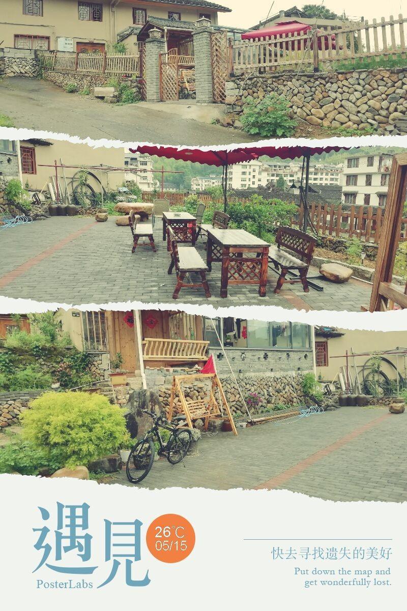 途径一个院落,门口简易的竹篱笆,底下是用鹅卵石铺设围成。清新自然中带点小院风情。从门口往里望,左侧种满了绿植,在这个季节里绿的喜人,摇椅边上停了一辆黑色自行车,右侧的平台之上摆了几张木桌木凳,撑上一把大大的遮阳伞。院子的几个角落坐上花,待在院子里看看书赏花,喝茶聊天,是一件很惬意的事情。余生很长,在这样一个悠闲的农家生活,每一天的日子都是五颜六色的。