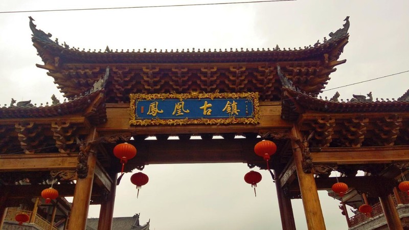 凤凰古镇的大门是一座气势磅礴的斗拱式仿古的牌坊,屋顶上停歇着众多形态各异的凤凰,屋檐下的斗拱层层叠叠,看着工艺就很是复杂,真的要感叹中国传统建筑的高超技艺。