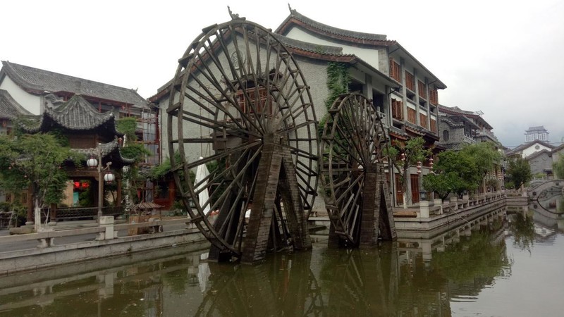 孔夫子雕像的另一边是一条人工修建的水渠,水渠里并排立着一大一小两个大水车,有很多色彩艳丽的锦鲤在水中嬉戏打闹,不时在水车下穿梭着。