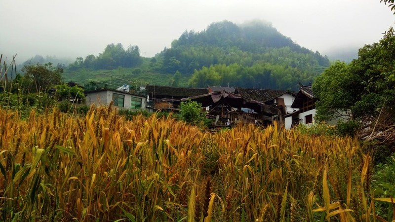 寨子入口处有一片已经发黄的麦田,在这青山绿水间那一块金灿灿的色彩显得异常光彩夺目。