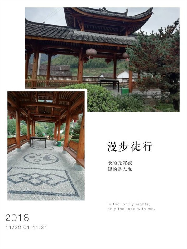 老房子的左边是一座亭子,亭子前面用鹅卵石围成的一个荷塘。塘里的水很绿,是那种浑浊泥泞的绿色。我从小道过去,穿过一条种满绿植的小径,亭子就在我眼前。两层的亭子,漆成棕黄色的木柱,黑色的砖瓦。褪了色的大红灯笼。在亭子中行走,脚下踩的是大小均匀的鹅卵石。地上用鹅卵石摆出的造型特别的别致有趣。以白色的鹅卵石为底色,配上黑色的鹅卵石做成一幅幅畲族的画作,特别有艺术感。亭子下有供人休息的座椅。倚靠在座椅上探出头来静静的观摩着水池。若是缝上下雨天,这个亭子是个避雨的好地方。
