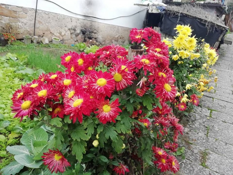 我顺着村中的小道前行,在村子里慢慢的行走。经过一处别致的院子。用大石块砌成底下的墙墩,铁艺的花篮挂在墙上。院门前的两侧种满了鲜花。恰逢秋季,地上的花,花开满枝,姹紫嫣红。一团团一簇簇拥着。花的品类很多,颜色也特别的艳丽。花朵在这个秋天竞相开放着争奇斗艳。好漂亮的园子,我想这里的女主人应该是个精致的姑娘,才可以将院子收拾的这么别致。开的最为好看的便是地上的粉白色菊花。簇拥这密密麻麻的匍匐在地上,许是因为花枝低矮的缘故,一眼望去,连成一片。花丛中还夹杂着几朵白色的菊花,仿佛给他润了色。我很喜欢这样的一个院子。如果有机会我也想以后我生活的地方,我能亲手打造一个美丽的院子,一面赏花一面喝茶看看报纸。