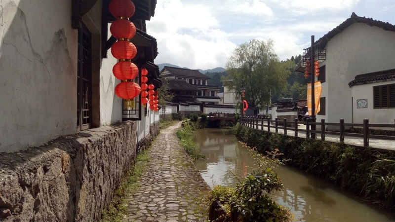 车子停下来的位置便是大祭村。从车上下来,环顾四周。这里的房子是白色的墙体,刷着暗红色的木质隔窗,一楼皆为商铺和农家乐。顺着村子中心的河道往前走,村落皆坐落在河道两旁,家家户户门前是用鹅卵石铺成的矮墙,在上面种上绿植,很有小院风情。河道旁边的树木因入了秋的缘故,叶也落光,只留下光秃秃的树丫显得几分萧索。