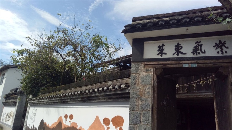 离开亭子向前走,旁侧写着风情食寨的木牌子已经腐朽。这里的房子皆分道道路两侧,地势随级而上。白色的墙面蓝色的彩绘腰带是这里房屋建筑的特点,有些门头也有些年岁,你似乎还能看到裸露出的原墙砖瓦。还有些是木制的门,因岁月的流转而腐 败不堪。