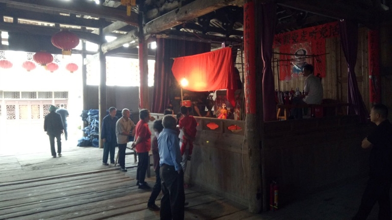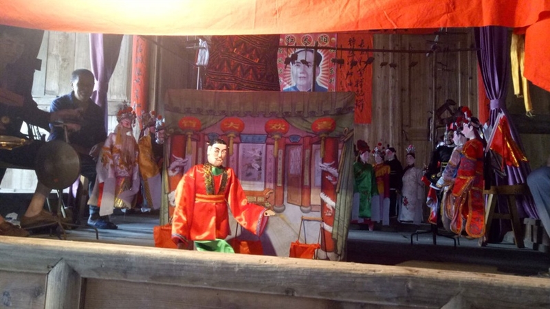 挂满红灯笼的胡桥里聚满了一拨人。有几位年迈的老人家在哪里表演木偶戏。他们身后是各种各样形态各异的木偶。每一个木偶都精心雕琢,刻画的唯妙唯俏,栩栩如生。因桥内光线昏暗,点了一盏黄色的暖光灯。昏黄的灯光,红色的幕布,木板墙上毛主 席的画像,仿佛重温了90年代。我饶有兴趣的看了一场表演。