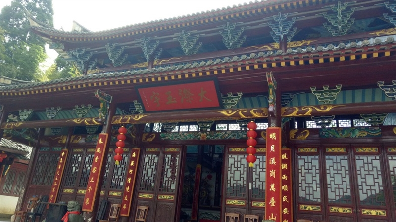 路边有条小径通往高处,高处有座寺庙,名叫玉宇殿。见到寺庙,哪有不拜的道理。大殿修建的较为富丽堂皇,深红色的殿身,配以金色的雕花造型,木柱上雕龙画凤,柱子上皆贴着金边红底的楹联,气势恢弘。拜过菩萨,又照原路返回,沿溪前行,便到了护关桥。