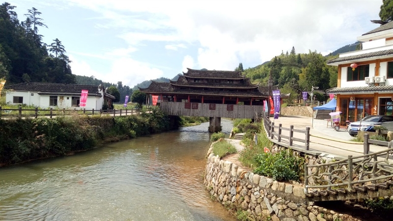 护关桥始建于清乾隆辛丑年,是三层三檐楼屋式木结构廊桥。廊桥上可以供通行的通道不大,可允许两人同时通行,腐朽的木柱上残留着岁月的痕迹,显得有些古旧,行道右侧透过隔窗你可以看到里面供奉的是菩萨像。