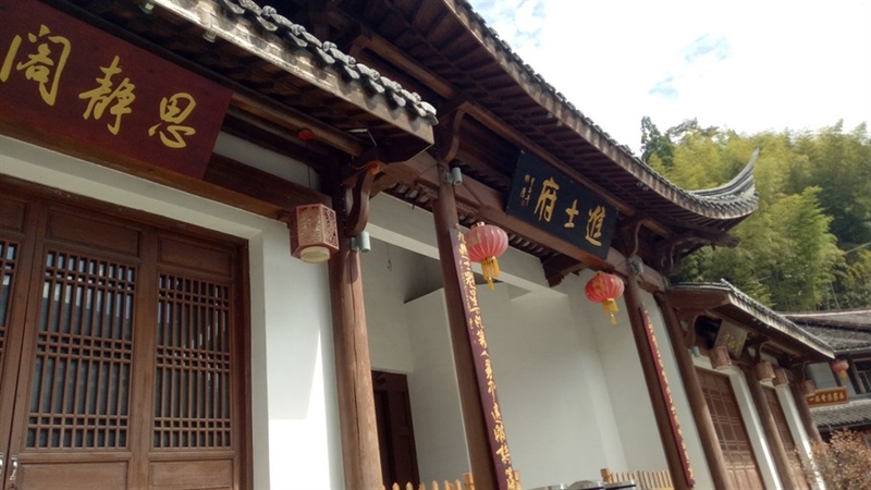 从这里走到河对岸的方向便是去往游客接待中心的路,途径进士府,进士府的门楼建的较为壮观,门头上用黑色的底色上面写上三个烫金大字,明晃晃的。左侧便是思静阁。一听名字都特别的雅致,带着一股浓浓的书香门第的气息。