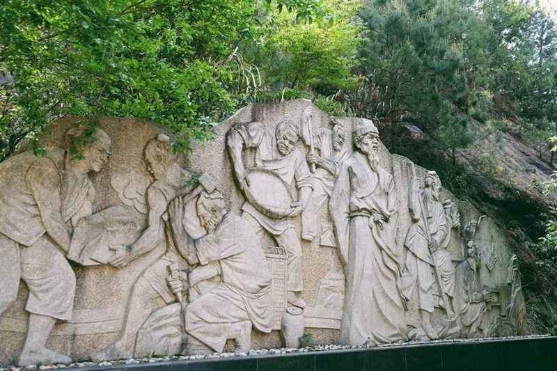 服务中心一侧的山体上有一组浮雕,浮雕内容是被贬的汤显祖在遂昌当县令的时候带领当地群众进行金矿开采的画面。
