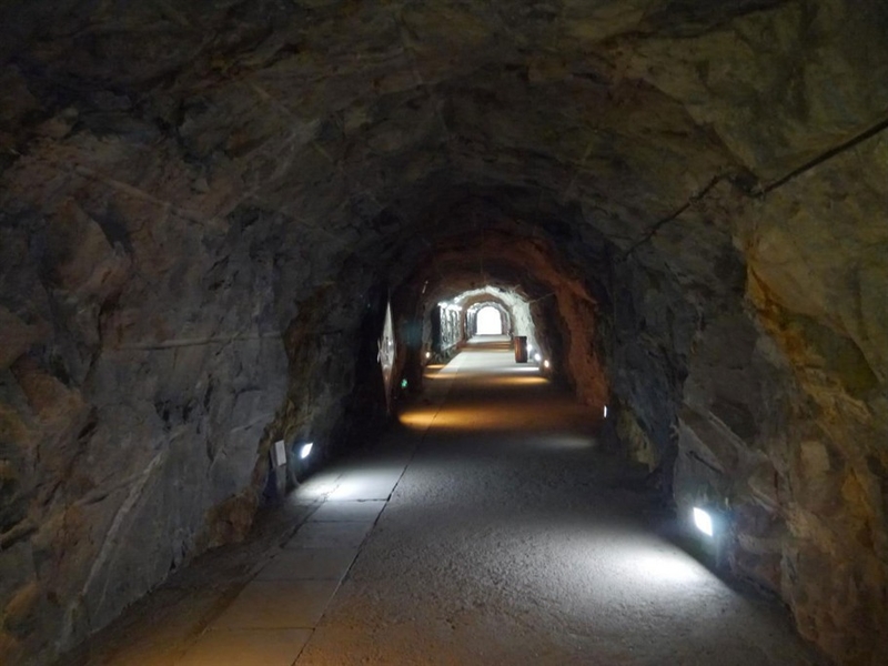 走进明代矿洞,这里到洞壁时常有水渗出,仔细睁大眼睛但却不见矿石的踪影。而且洞内异常的凉爽,穿短袖进来竟然开始起鸡皮疙瘩,这绝对是到达山体深处了啊!走在矿道里,耳边时不时听见轰鸣声,说实话心里一凉,有一丝惬意!后来才发现那是奔跑在山体里小矿车的声音。