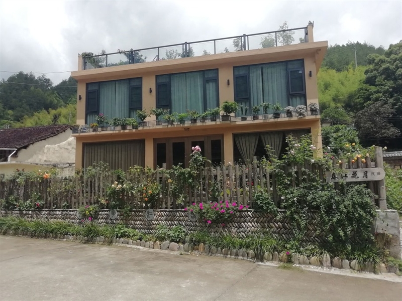 一个春江花月民宿出现在我的眼前,底下一排整齐均匀的鹅卵石以鱼骨交错的形式一字排开错开堆叠在一起形成一个低矮的墙墩.灰木色的篱笆之上,蔷薇枝缠绕着,玫瑰枝叶从篱笆的空隙之中探出头来。围墙之内,密密麻麻的种满了鲜花把整个篱笆包围起来,枝条之上,各色玫瑰把整个庄园装点的绚丽多姿,这仿佛是大自然的馈赠。民宿旁边有条小路进去,沿路开满的是彩色的菊花。各色的菊花交错相辉的开在一起,花瓣大朵像一个个彩色的风车一样,风一吹。仿佛就会旋转起来,带着幻彩童年的梦。