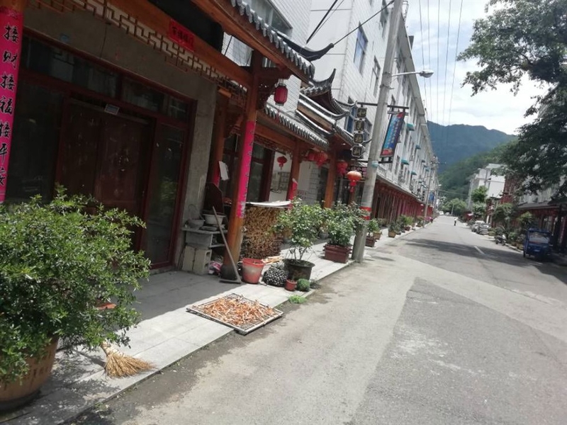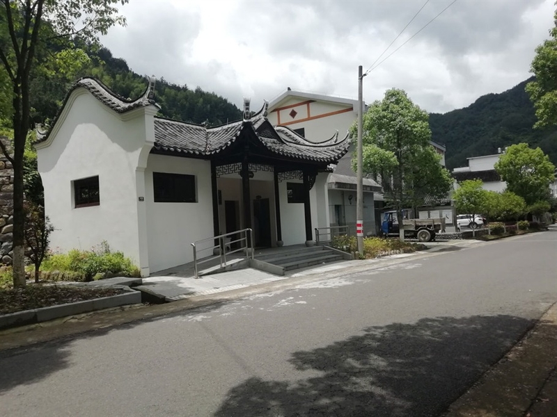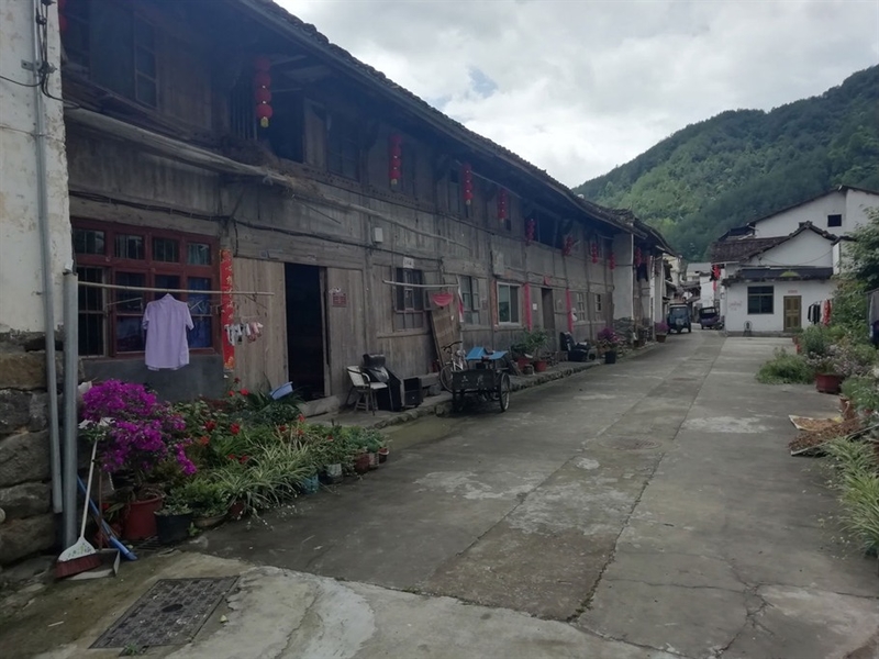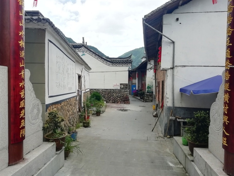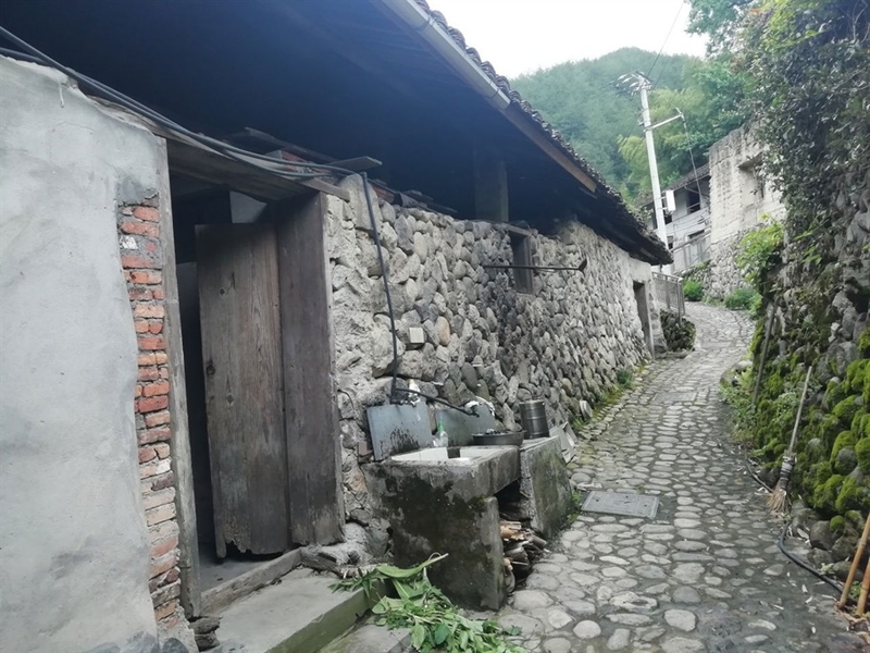 沿着林子一直往前走,面前是一颗大树拦住了我的去路。它从主根伸出侧枝,垂落下来又仿佛在跟人招手。这是一颗马尾松。从树的年轮上看少说也有100年的历史。小路深径通往的是几许人家。在远远看去感觉前面已经无人烟,身后是一片密林。过一个凉亭之后便是一户人家冷冷清清的立在哪里。门前的小路是由鹅卵石铺设而成。墙壁上因常年潮湿而长满青苔。