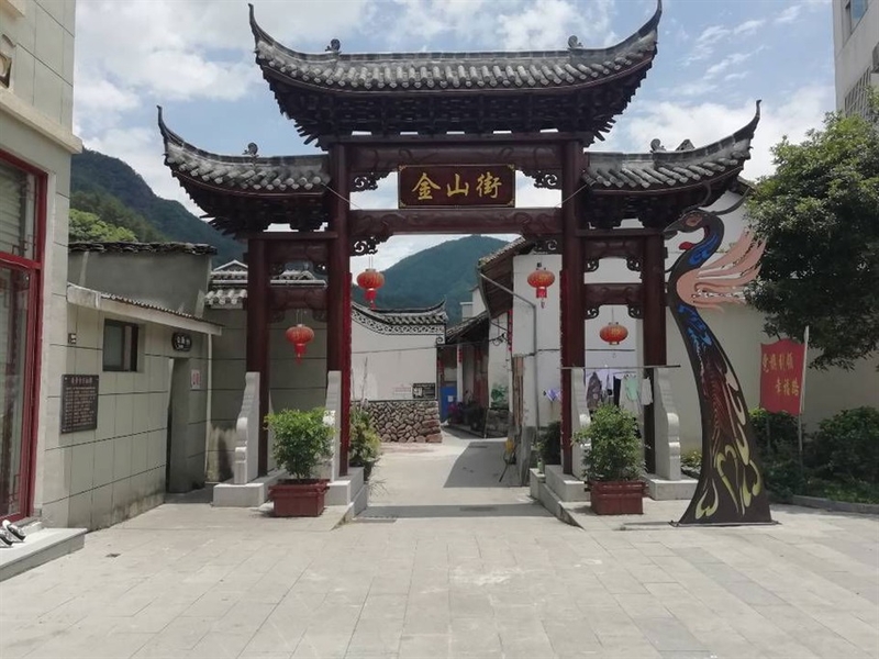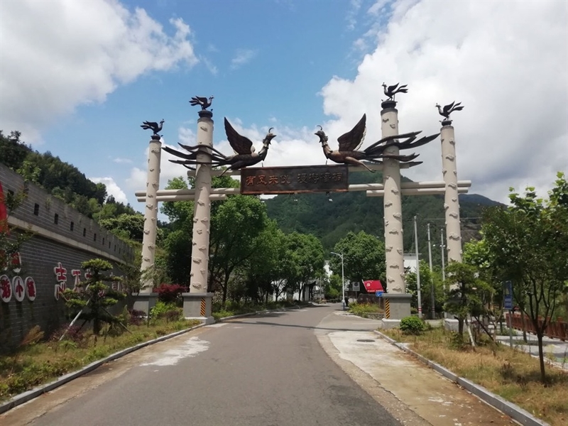 往前走几步,便到了另外一个村落,梧桐村。还未入村口,我便被这个村落的大门所震撼。两侧成坡度高度不一的四根柱子立在哪里,直冲天际。柱身之上,刻满了祥云图案。密密麻麻的祥云图案仿佛柱子上开出的朵朵白花。四柱之间横叉着四根小柱子如同四根筷子两两相对拖着中间那个铜铸的刻着“有凤来仪,漫游梧桐”几个大字。铜牌之上,两只凤凰相对而立,做飞翔状凤凰的尾巴包裹着柱身。每个柱子之上依次落着一只凤凰,高抬前腿,仿佛下一秒便要展翅高飞。整个大门非常的气派。门上的凤凰更是微妙微俏。凤凰本就是畲族的吉祥物,这也表示景宁人民对凤凰的崇高的敬意和热爱。