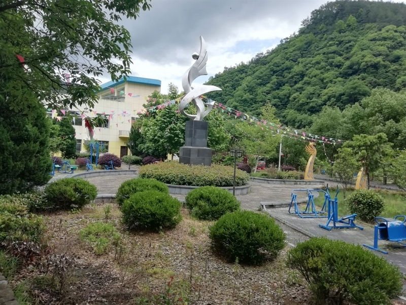 此刻的天空多了几分蔚蓝,有流云在天空中浮动着。向前眺望着,风卷着残云涌过来。过了大门之后,在马路边上的公园一角,我隐约看到了隐藏在枝叶间的一处凉亭。石质的凉亭有两层顶,六个角之上分别有一条磐龙从中心点往外,龙头朝上,仿佛在仰天长啸一般。因年代久远,整个亭子的颜色显得暗沉昏黄,檐顶之上也落了灰。柱子之上依稀可见上面的刻字。外面的天很热,走了一会瞬间汗流浃背。正好坐在凉亭里休息会。虽是无风,躲避了日头,也稍好些许。在这样的天气没有带上一把遮阳伞真是不明智之举。沿着马路往前走,便是公园的中心点。中间黑色的石墩之上拾一个银白色的雕塑,恰似一个立着的凤尾,四周由彩旗拉着,旁侧花坛里的绿植也被修正的很平整。