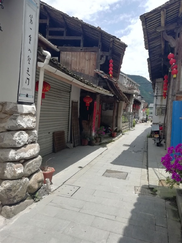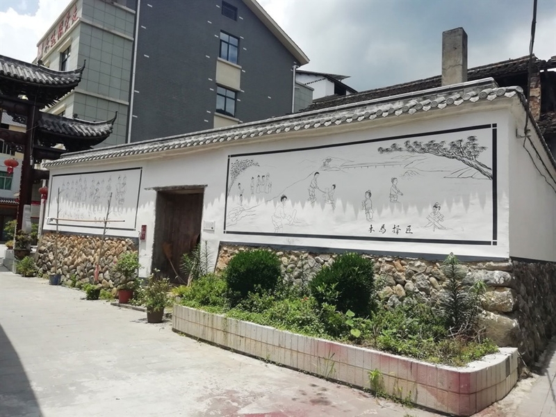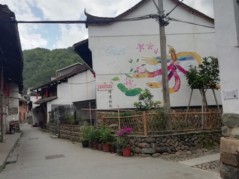往前走拐个弯,便是这里的老街,老街的房子都很陈旧,破烂的旧门,腐朽的旧屋,木板干瘪无力因时间久远失了颜色,颜色陈旧的你完全认不出它本来的面目。就像一张放了很久的废报纸一样黯然失色,仿佛失去了生命一般。又如同一件破衣服早已经千仓百孔。似乎一阵风过便会轰然倒塌般弱不禁风。村里的年轻人都出去了,所以留下的人多半是老人,老人守着旧屋,仿佛也在守着一份期待。这个旧屋陪伴了他们的前半生,后半生也便像亲人一样相依为命。巷子里的老房子很多,一座挨着一座。刷的粉白的墙上也被绘上了墙画,皆是凤凰图案。