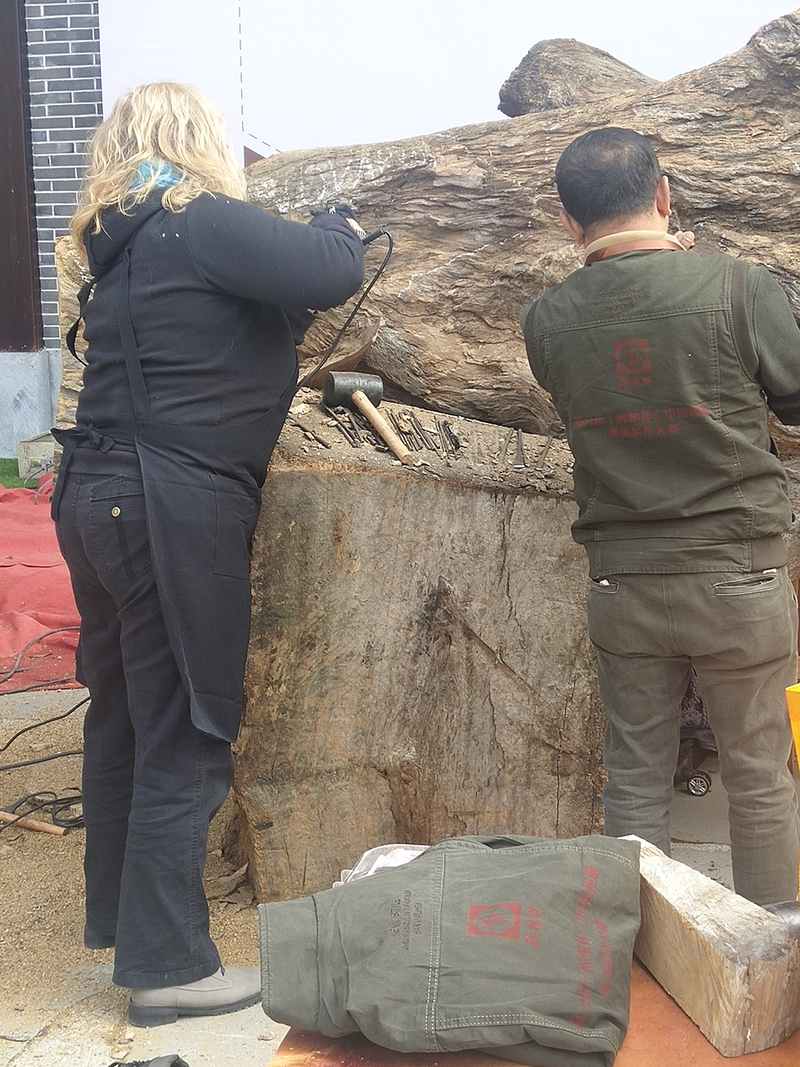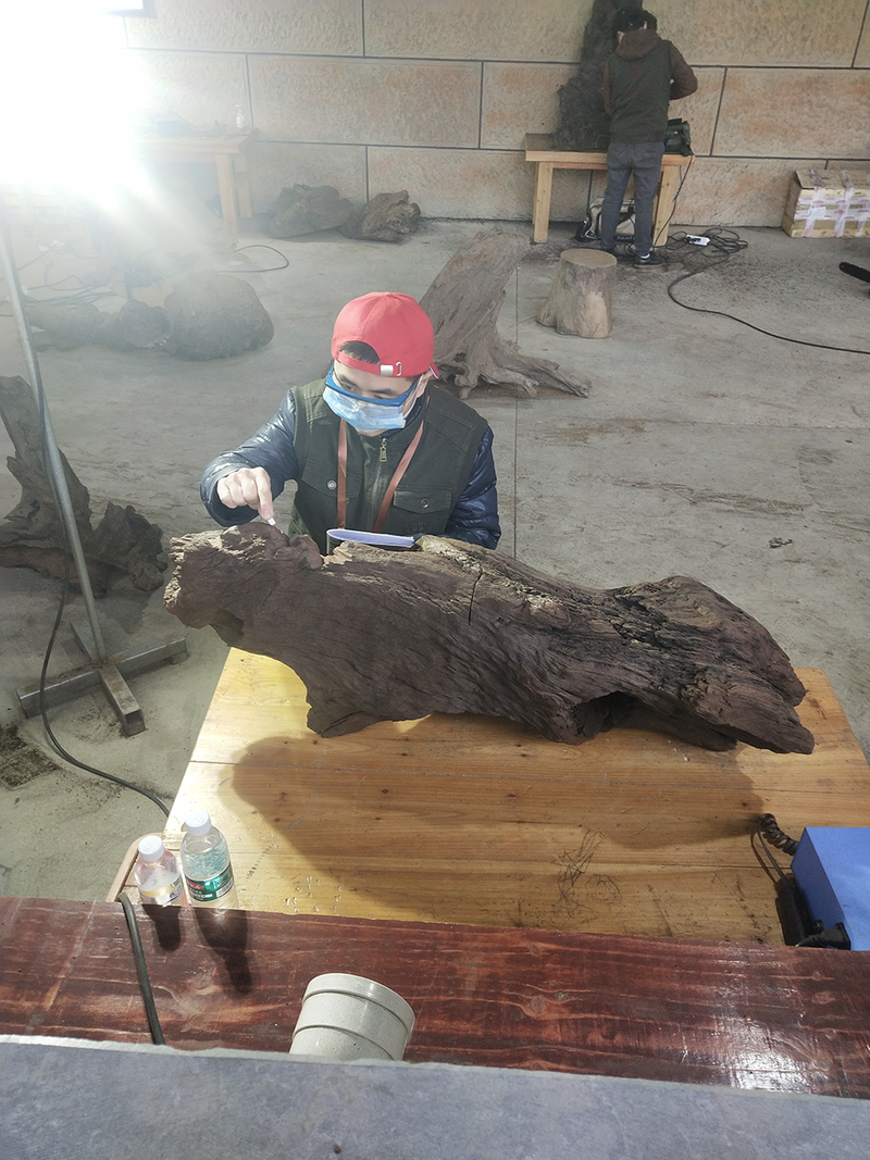 一位黑人大叔,已经抡起锤子和刻刀卖力的开始了自己的创作,根雕也是一个力气活啊!看着一连声凿响,树根上已经出现了几道深深的沟壑,期待大师的作品吧!