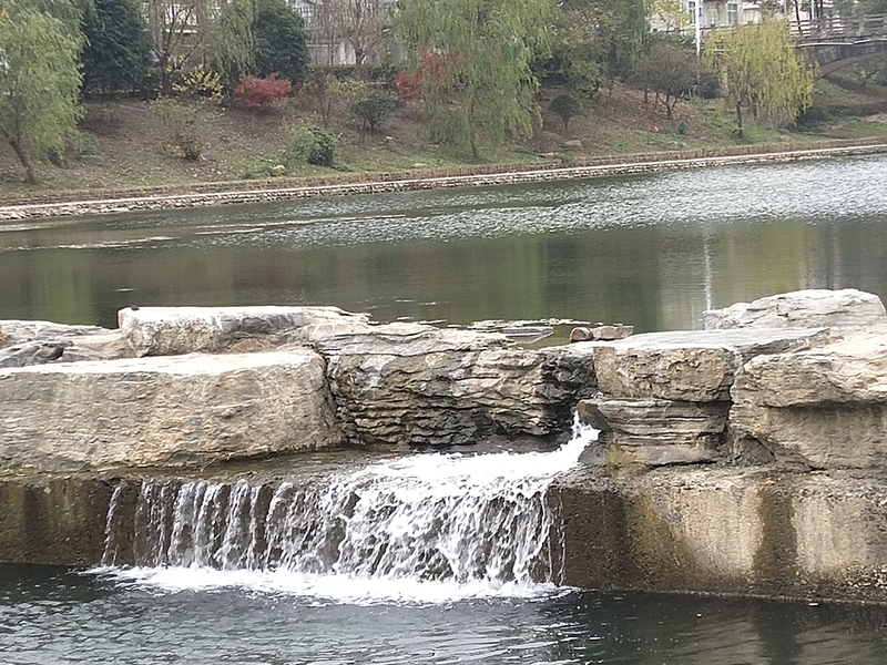 河里用石块做了一个低矮的石堰,清澈的水漫过石块的顶端,奔流而下,瞬间激起一层一层的浪花。