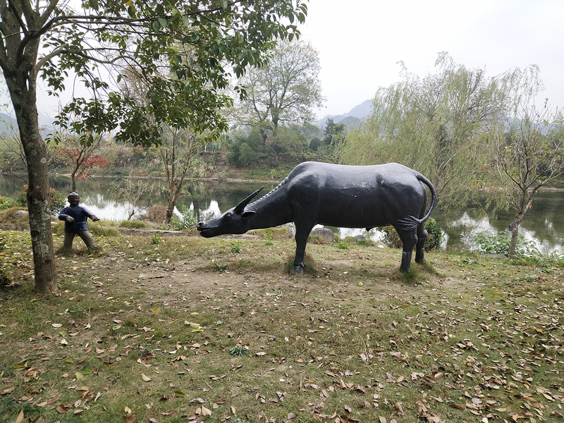 不远处有一头大大的老水牛,兴奋的跑过去,才发现是河边的铜像,还有个小小的放牛娃在使劲的拉着老水牛回家呢!远远看着还以为是真的水牛!