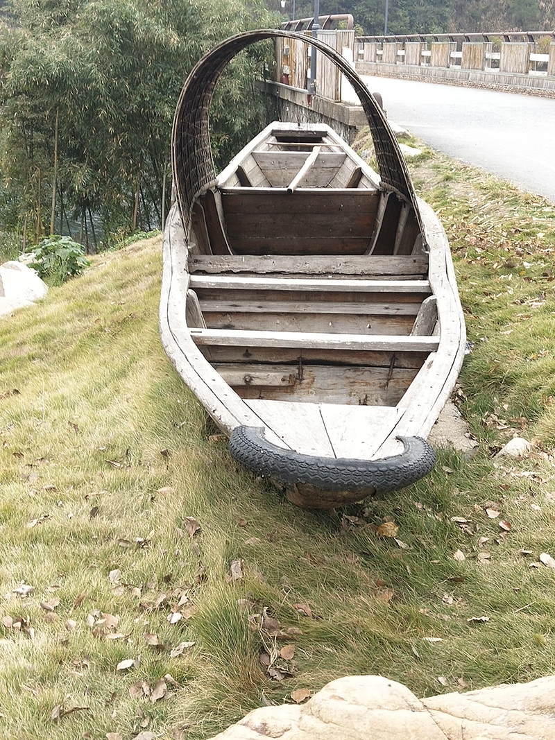 河边的草地上休憩着一艘小乌篷船,想着这船穿梭在烟雨朦胧的河面上,那景色一定如诗如画,正如歌里唱的那样:“烟雨入江南,山水如墨染,宛若丹青未干,提必然,点欲穿,行舟临秀川,画鷁推清澜,缱绻怡然,天色沉靛蓝,波光似锦缎,缀着零星白帆,诗情满 千卷难,渔舟齐桅杆,鸳鸯凭舷栏,琴瑟相伴,一叶轻船,一双桨悠懒,一绵江风微拂素罗衫,渔火点点聚散,欸乃声声浅淡,天近晚,炊烟袅飘沿斑,一叶轻船,一双人倚揽,一曲烟雨行舟太缓慢。”