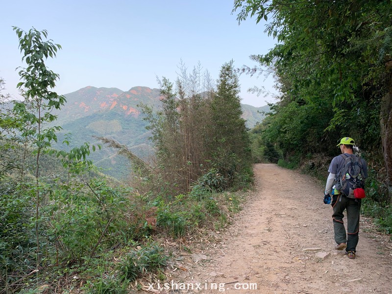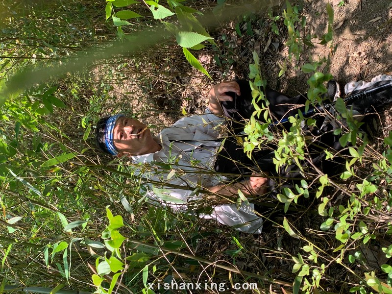 天气炎热,气温很高,山上基本没风,闷热的空气让人喘不过气来,从山脚开始就是一路的上坡,细细的羊肠小道埋没在细细的竹林中,那种细细野笋长成的密密竹林,竹子的枝条就像鞭子一样持续地敲打在每一个人的身上,裸露的皮肤上不可避免出现细细红红的鞭痕。
