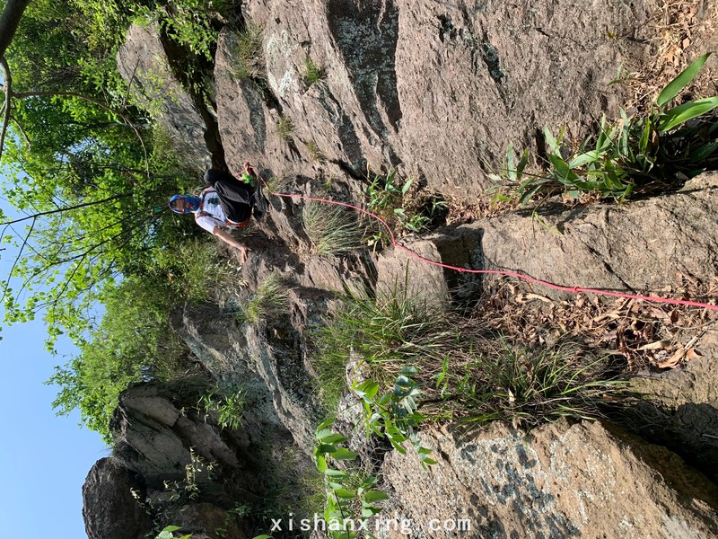 好不容易走出灌木丛林,来到一处悬崖旁,用到了玩速降用的岩绳,拉着绳子慢慢下滑,这是一种野外徒步遇到难度的时候才采用的措施。