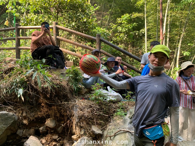 下的山来,来到一个有台阶的山谷边,看见了溪水,犹如看见了情人一样亲切,一会儿工夫13个队友都到了溪水边,领队出乎意外的拿出了那个宝贝一样的西瓜,大家一起围坐在溪水边开始吃西瓜宴,吃到了“最好吃”的西瓜。接下来队友各显神通,采用各种方式用凉爽的溪水给身体降温。
