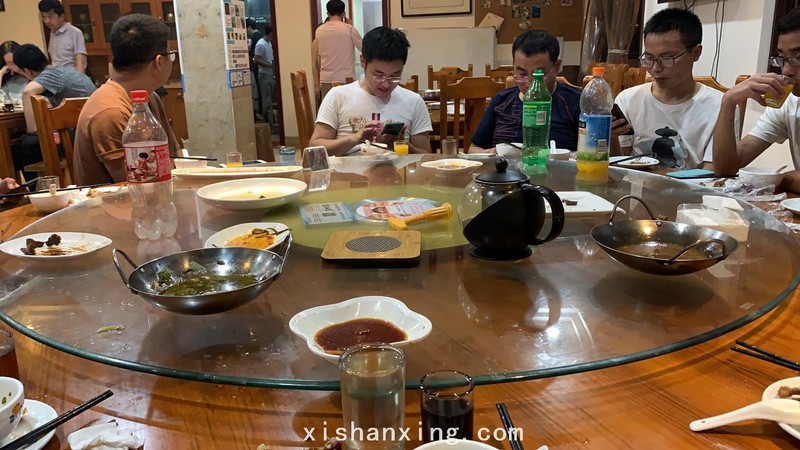 晚餐在一家叫竹隐山居饭店吃,大家就像是饿了好多天的人一样,没有了常规饭桌上的矜持模样,桌上看不见一道有菜的碟子,一个菜上桌还没有转二圈就空了,米饭是一盆接一盆地上,最后吃到饭桌上连菜汤都看不见一点,好像回到了60年代那个困难时期吃饭的情景,那种吃饭的味道真好。