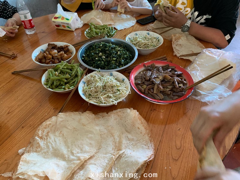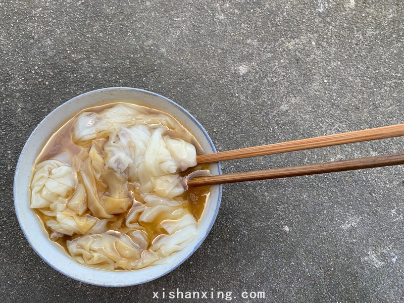 这是一个位于新昌县儒岙镇叫横板桥村的地方,这里可以看到很多古老的房子,是一个远离城市喧闹,身处山里的村庄,农家的午餐是麦筒饼加馄饨,柴灶上炒出来的各种菜摆放在桌上,类似于山东杂粮的煎饼也放在桌上,吃的人自己卷制,看我傻乎乎弄不清楚的样子,主人给我卷制了一个大大的麦筒饼,里面有大块红烧猪肉、炒茄子、炒四季豆、炒豆芽、咸菜炒笋,食材新鲜口味纯正,非常好吃。馄饨也非常好吃,满满的都是那种农家味道。