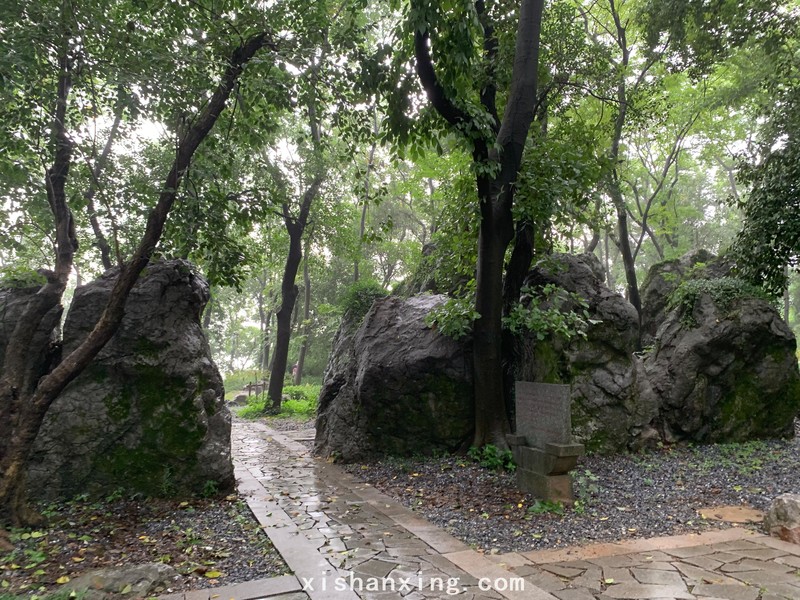 吴山出发经云居山穿越万松岭路到万松书院,过凤凰山到老玉皇宫,沿玉皇山盘山公路往九曜山方向进入一条茶树中间的小路,这些都是以前常走的路线。考虑到小路泥泞不好走的原因,这次活动的路线有变化。过凤凰山没有全走小路,在进入第二条小路前,走了好多的台阶路来到山顶上一块很大的平地,上面有大片的树林,树林中巨大的乱石从中一条小路曲径通幽,好像是一个历史的古迹所在。