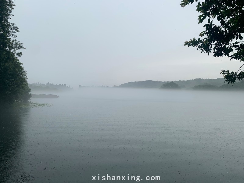 雨越下越大,3点从农家乐出来,冒雨走到茅家埠一带的水域边,突然发现雨中仙境,大雨下的湖面上聚集起大量的水汽,水汽慢慢上升并停留在水面上方浓缩,没有扩散前的水汽越来越浓密,形成难得一见的云雾,远处青山衬着近处水面缥缈的云雾,宛如仙境。此时此景是今天雨中的最美风景,是无数次的雨中漫步都不一定可以看见的美景,而且美景呈现的时候很短,不是谁都能看见的,云雾聚集的浓度、时间随周边环境气压、气温的变化慢慢变化,最后扩散稀释,消失的无影无踪,仿佛从来就没有来过这里一样。非常幸运让我们看见这最美的风景,因为我们是户外运动冒雨徒步的勇敢者。
