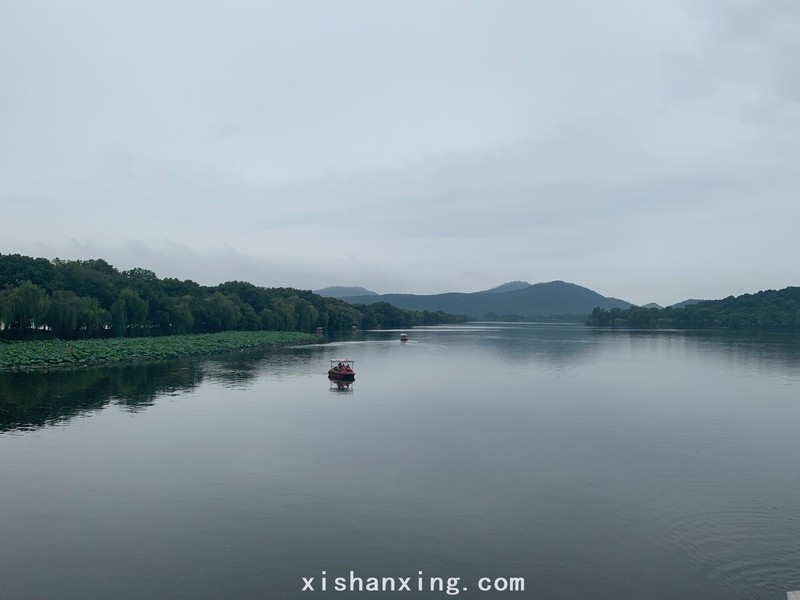 茅家埠后面的路线没有新鲜感,上香古道、曲院风荷、北山街、少年宫,都是以前行走过的常规路线。但是雨中的风景还是不同。大雨中的西湖特别的干净,远处云雾缭绕的群山看的清清楚楚,湖面清澈明镜一般,小船在湖面上划行看似如画。