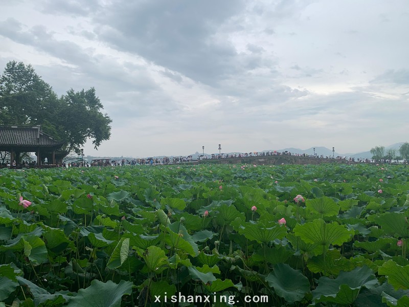 雨中的荷花娇羞,花苞上面的晶莹水滴,犹如少女的泪珠,让人徒生怜悯之心;盛开的荷花光鲜照人,犹如看见成熟的美人,让人左顾右盼。荷叶衬映荷花,绿叶红花,经过大雨洗刷,格外洁净、美丽。北山街入口处,水面上一大片盛开的荷花与毗邻的长桥相映湖面,引游人无数,他们的眼里大雨仿佛已经不复存在。