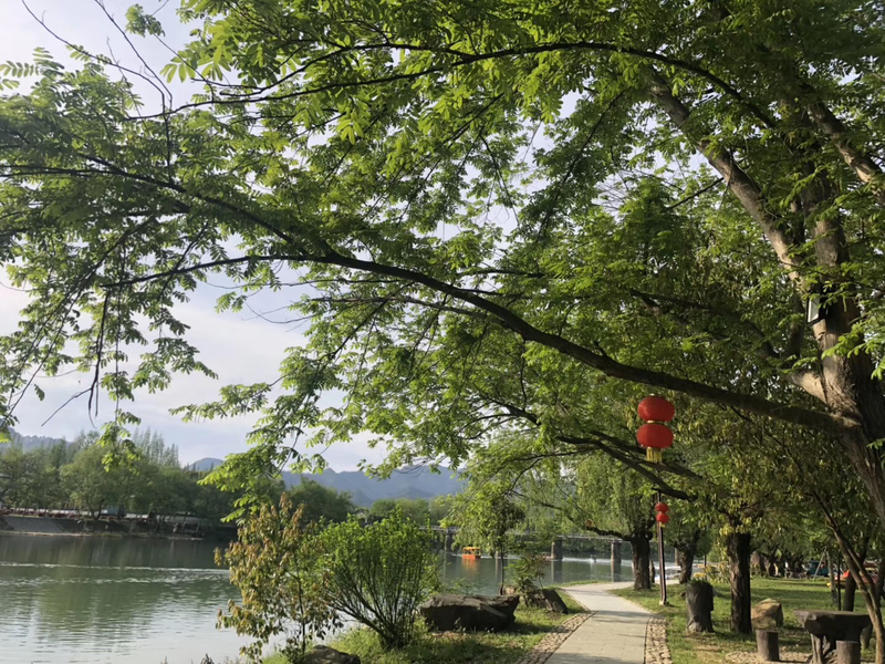走下石桥,是一道石砖铺砌的小道,右侧是翠绿的草坪,树上张挂着红灯笼,碧绿丛中一点红。行走在绿道边上,听着知了的声声鸣叫,看着对面的巍峨的青山低音唱和着。这里是聚餐郊游烧烤的绝佳圣地,在绿茵中伴随鸟叫虫鸣,看看身边玩耍嬉戏的孩子,真是别有滋味。