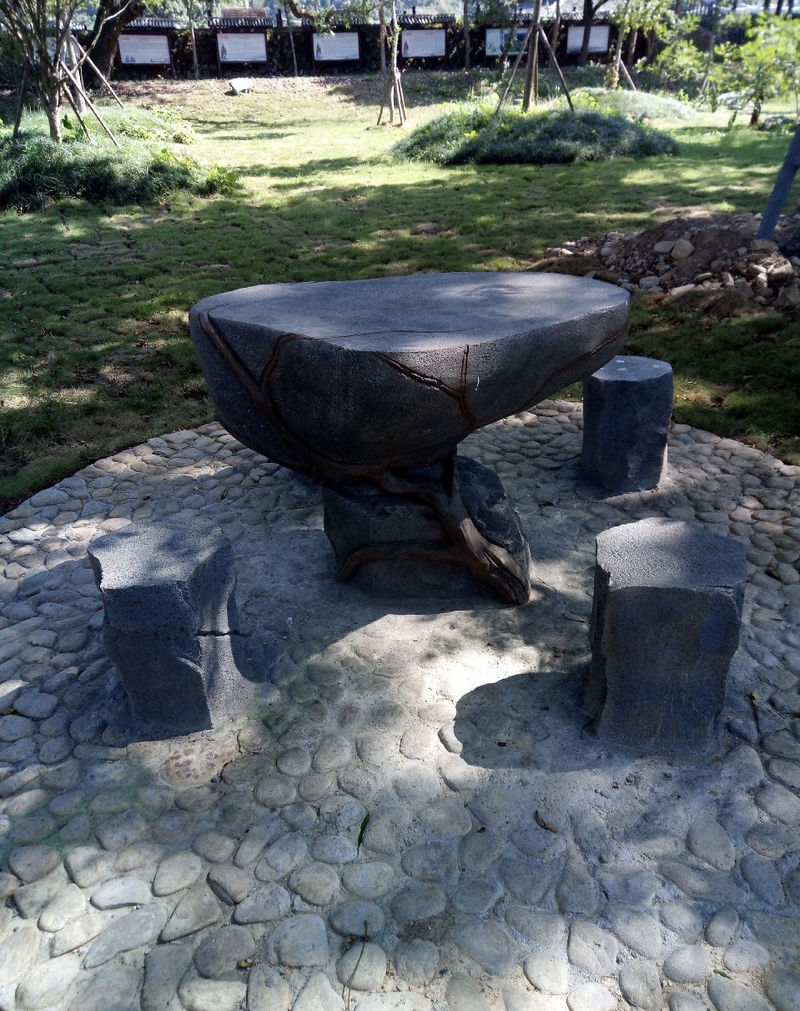 坐在石凳上,头顶是茂盛的樟树,为游客带来一片浓阴,安坐在石凳上,感受丝丝凉爽,看看对面潺潺流动的溪水,看着微风吹起的水面,岸上的柳条倒影在水面中,和溪中的水草交相辉映。