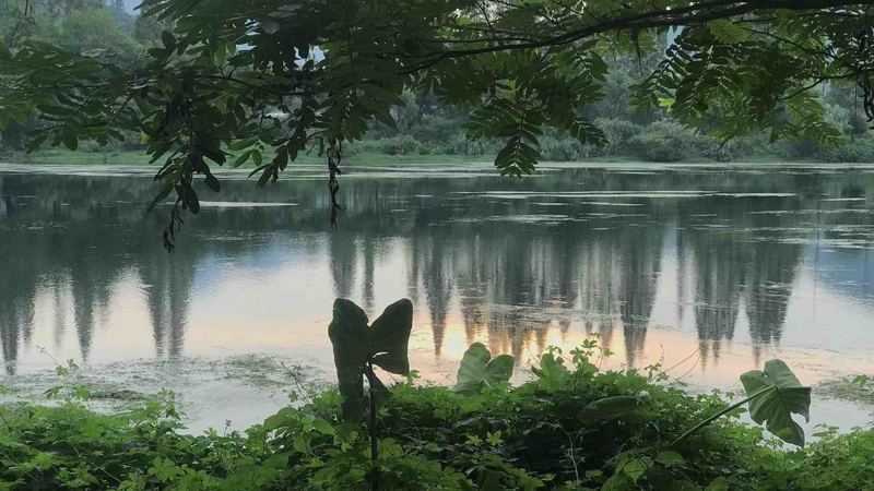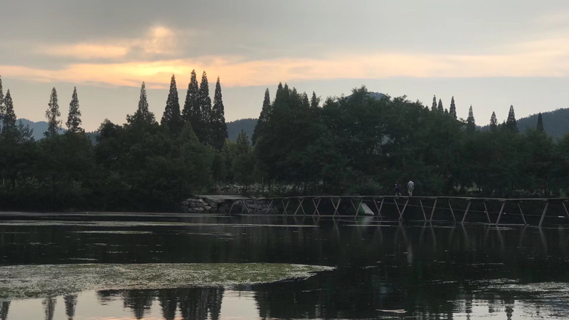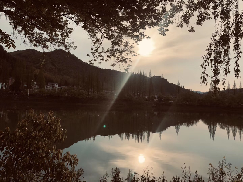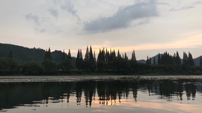 溪中搁浅的浮萍簇拥在一起,面向镜面般的溪水,做个深呼吸吧,尽情地在下淤做个肺部SPA。天空中泛着红晕的晚霞倒影在水面上,“一道残阳铺水中,半江瑟瑟半江红”,有没有感觉自己穿越了时空,追随诗人到了古代,想和他一起泛舟水上?