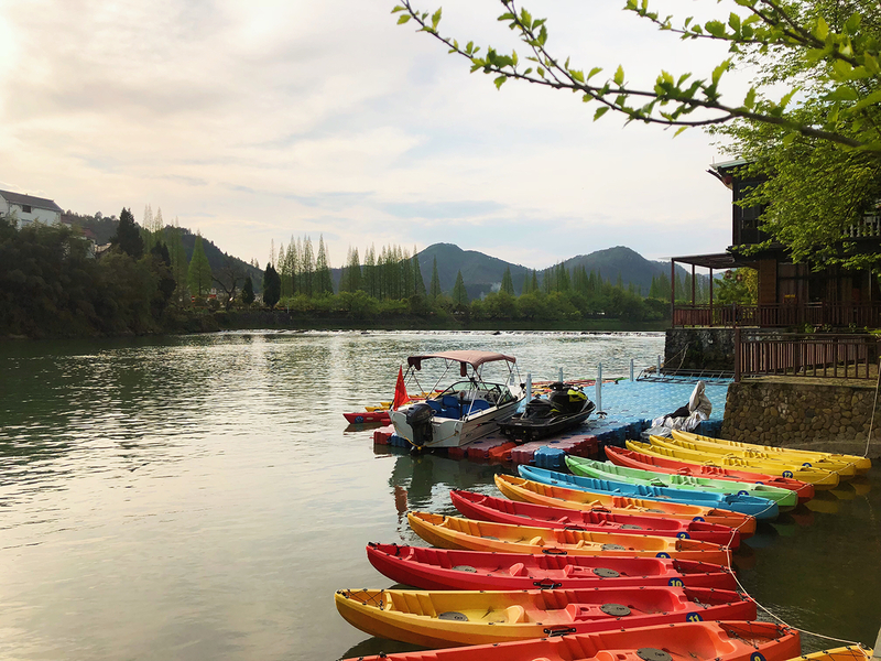 顺溪而下,可以看到斑斓的游船,五彩缤纷的的游船为青山绿水又增添了生趣。
