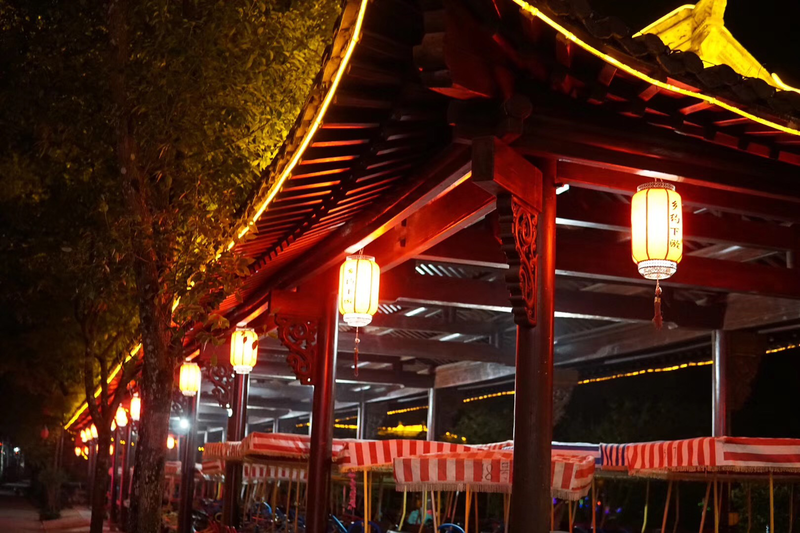 夜幕降临,夜间的长廊闪烁着红灯笼,飞翘的屋檐携着金色的霓虹灯一起守候着下淤。