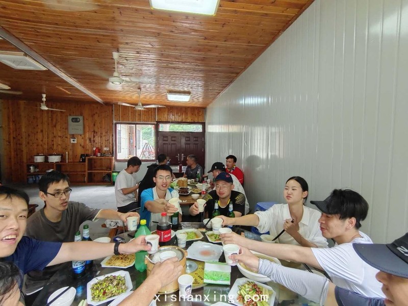 午饭在一家叫“山水人家”的农居吃,运动后的队友胃口好的惊人,桌上高高的饭桶一会儿就见底了,9个人的饭桌,每桌都要在3桶以上,当然,吃了这么多的米饭和桌上的菜太好吃也有关系。