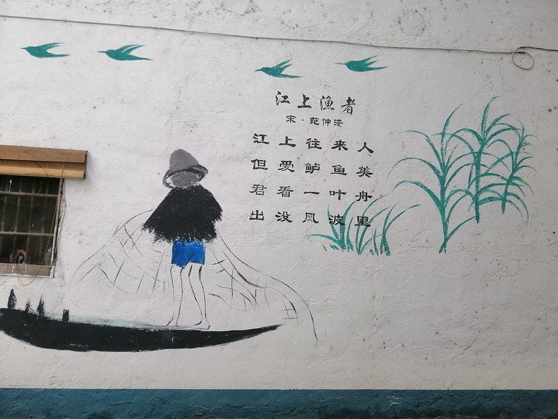 这面墙上是一首五言绝句诗,渔夫戴着草帽,披着蓑衣,载着扁舟在湖面上撒网打鱼,天空中依稀飞过几只小鸟,显得那么凄冷,但这也正体现了渔民劳作的辛苦,画面简单干净,保证美感的同时又将小诗主旨情感表现地淋漓尽致。