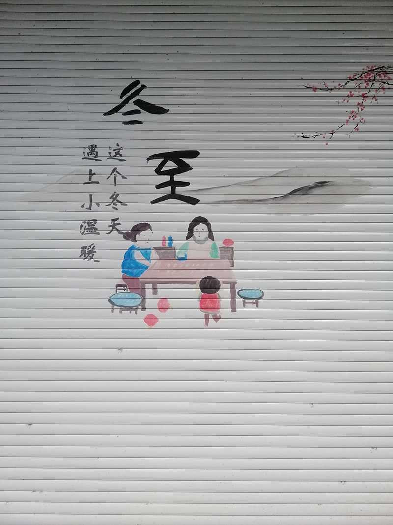 腊梅爬上门头,冬至到。贤惠的女人(我猜想他们是婆媳关系)开始忙碌起来,一位负责擀面皮,一位负责包饺子,肯定少不了那个最调皮捣蛋的小家伙,等家中的老少爷们下了班一齐吃碗热腾腾的饺子,寓意冬日不再寒冷,这是冬至正确的打开方式。原本单调的卷门经这么一描绘变得更有生气,更温暖。好奇的是大家伙门上的彩绘都如此精彩,难不成家家都藏了一位大画师?或者是这只是村部统一设计统一安排?