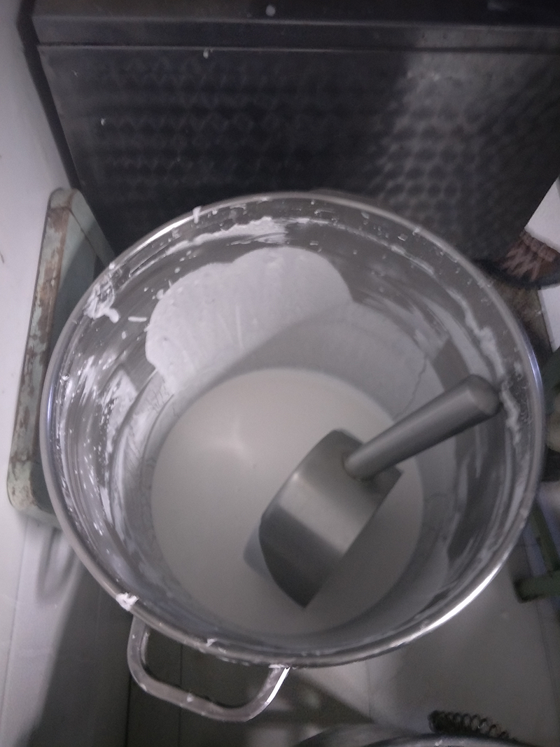 向工作人员请教后才知道,做开化气糕首先第一步就是做“酒引”,捣碎的酒曲和在米饭里放在灶台上慢慢发酵,一星期后制成“酒引”。再采用粗糙的早稻米为原料,将米浸泡一晚后,用石磨或机器磨成粉,小窍门是在磨的过程中加一点米饭进去,这样做出来的气糕会更筋道。加入水就变成了米浆,经过数小时的发酵,米浆就会不停地冒着气泡。这浆不能太稀也不能太浓,而要根据天气变化不断调整,否则做出的气糕不是太软就是太硬,咬起来总缺少弹性。还要注意每舀一次米浆都要搅拌均匀,以防米浆沉底。