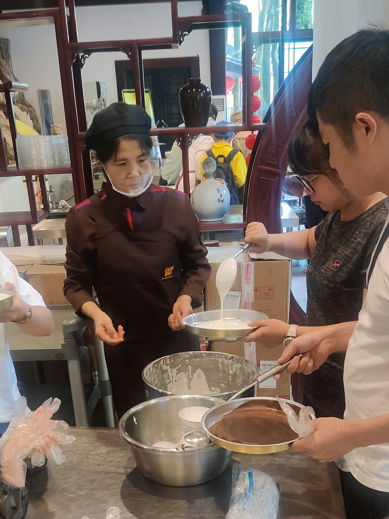 这次制作气糕的工具也别具一格,分发给每个小朋友一个小圆笼屉,在铺一层笼屉布,就可以开始“DIY”啦。第一步是舀两三勺发酵后的米浆,再用勺子慢慢均匀地摊平,因为这一步骤稍微有些难度,所以基本都由家长代劳。
