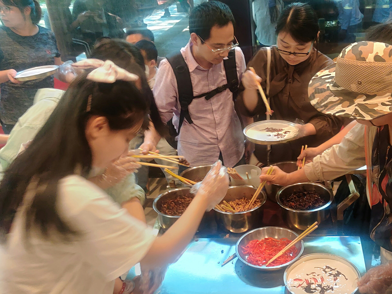 第二步就可以带上小朋友加入啦,根据个人口味,撒上事前用菜籽油,食醋,酱油,黄酒调味好的香干丝、木耳丝、肉丝、红辣椒丝等馅料,有些地方还会加些虾皮之类的,味道十分鲜美。