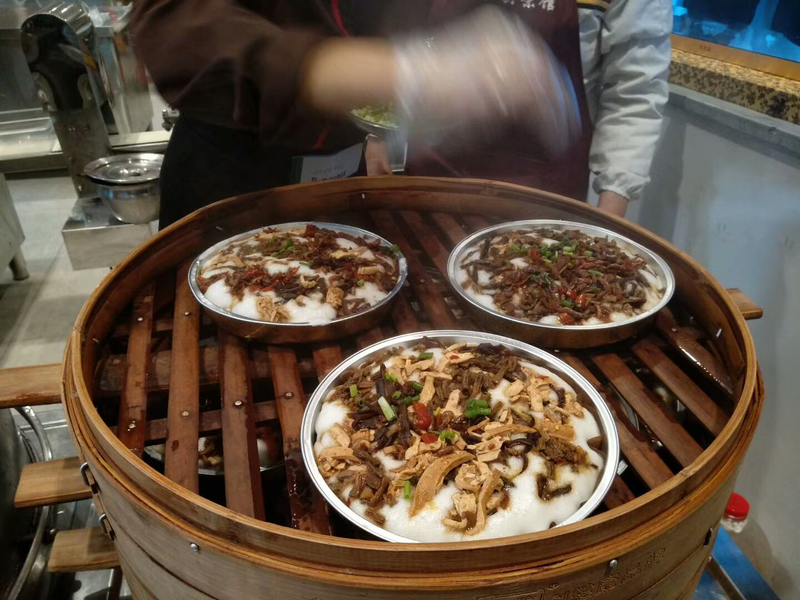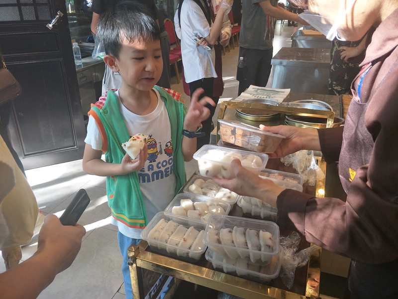 刚出炉的气糕冒着热气儿,肉丝和香干丝糅合的香气扑鼻而来,让人欲罢不能。在自己的位置上等待着工作人员过来帮忙切成菱形小块,米香混合着菜香,香味让人垂涎三尺。