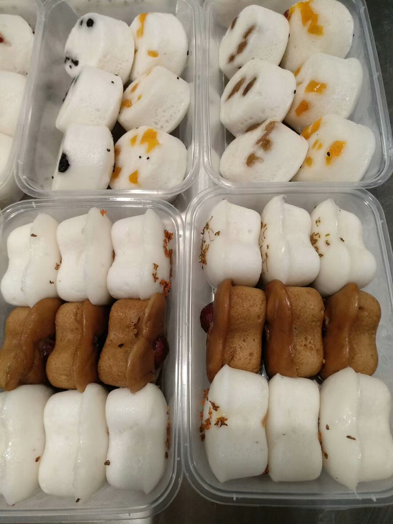 第三步就是把一个个小笼屉放置在大蒸笼上,盖上锅盖,不停地加热,蒸汽从圆孔中徐徐向上飘出。不一会儿,厨房里就弥漫开浓浓的香味,让人垂涎欲滴。十分钟后,一个个厚约1.5厘米,香糯适中,洁白晶莹,松软有弹性的气糕便做成了。