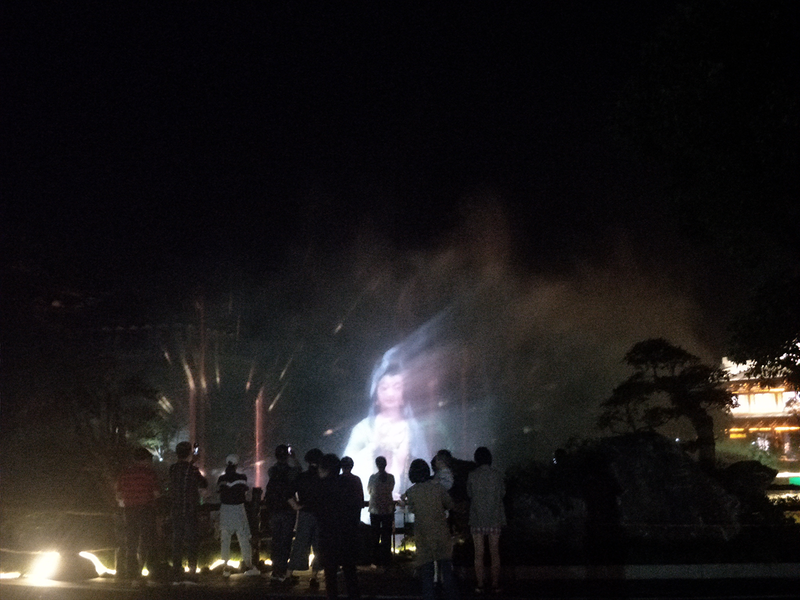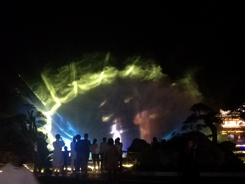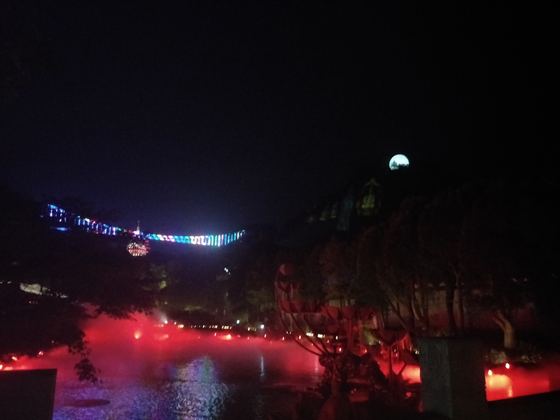 夜幕降临,18:45夜宴水秀灯光开启,景区呈现了另一番美象,19:10-19:40在华夏水域进行的水幕电影和山体投影,亲测在童趣园前观看效果最佳。画面从左侧山顶的“月亮”投射过来,向上喷射的水雾,加上背景音效,让人仿佛身临其境,栩栩如生,美轮美奂。