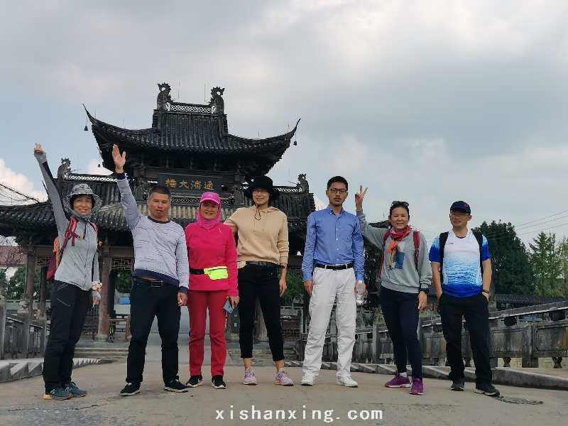 不知不觉骑到那座古色古香的通济大桥,8个人一字排开站在大桥中间拍了集体照,而后右转进入苕溪左岸。