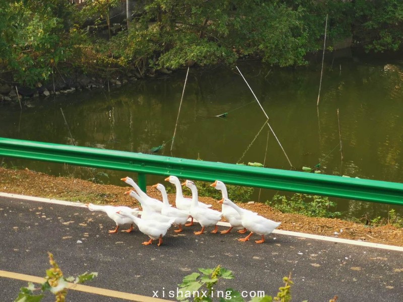 回程的路上偶遇一队白鹅走在距绿道高差约2米下的小道上,看见我们的车队过来,9只白鹅立即列队,哦哦喊叫着,在领队鹅的带领下集体向我们行注目礼致意。我们8人立即下车挥手回礼,