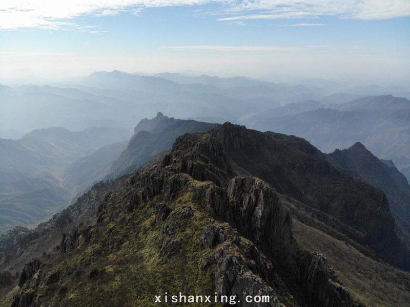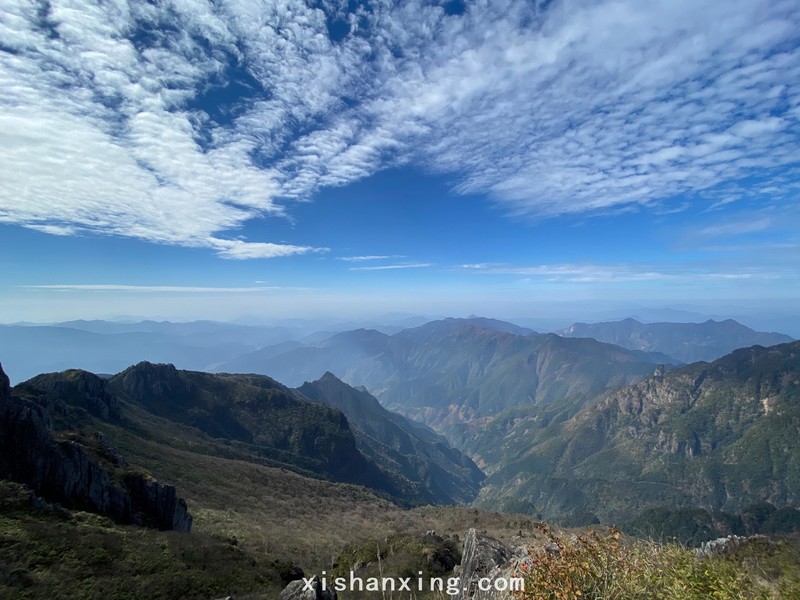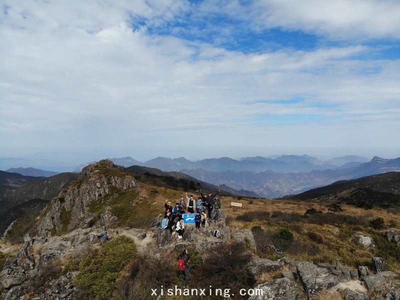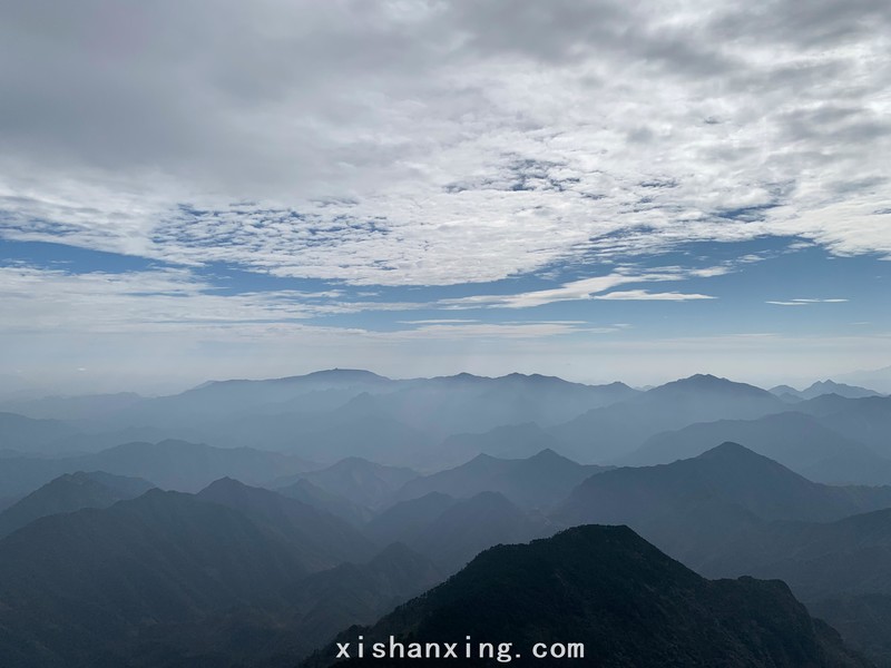 站在最高处极目远眺,茫茫群山覆盖整个大地,蓝天白云包裹整个群山,除此之外,再也看不见其他东西。以前去过的徽杭古道、吴越古道、大明山、黄山,还有什么三尖、七尖等等都已经包含在这些群山之中。