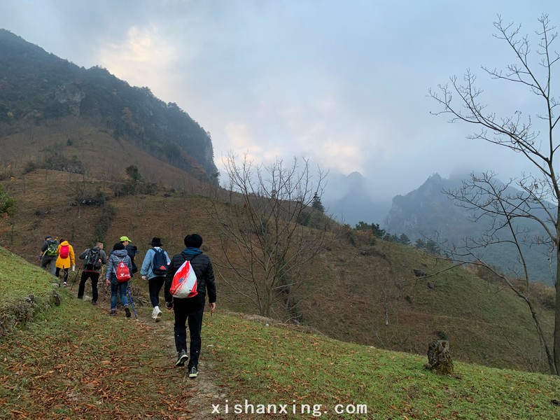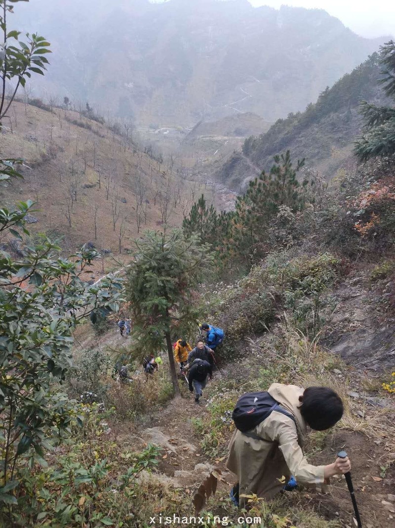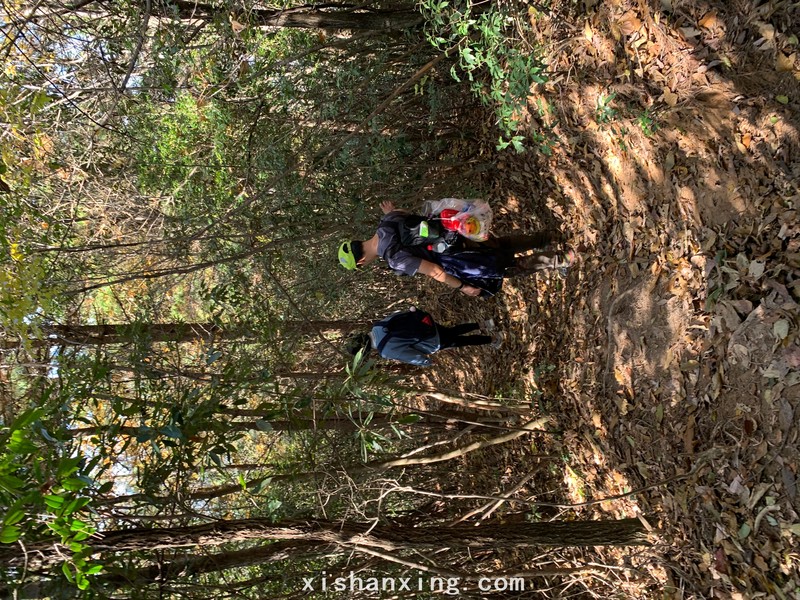 早上6点多一点出发,出发点的海拔高度约700米,看见一路斜斜向上延伸的羊肠小道,没有水平缓冲路面,脚踩在厚厚树叶覆盖的野道上,沿着连续上升的陡坡行走不到半小时,我的心跳频率就加快,气喘不过来,第一次动了下撤的念头,休息了5分钟左右,才缓过劲来,整个队伍在前面的独木桥停下等我。